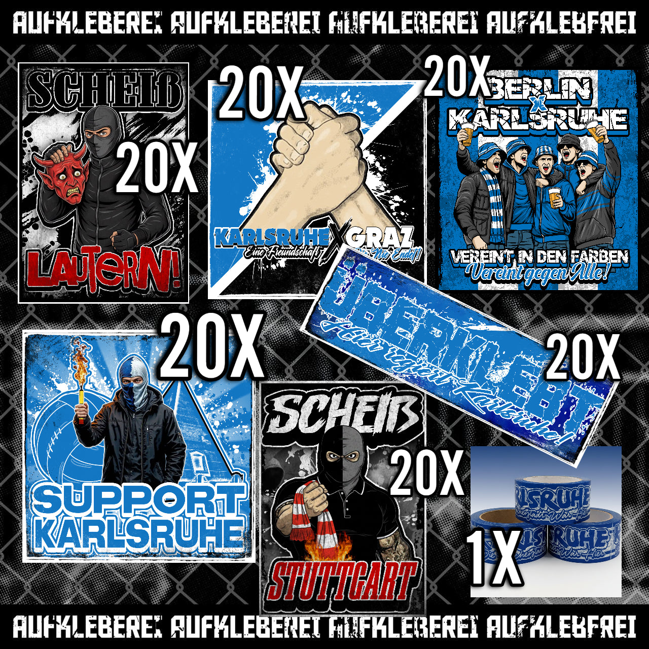 Dieses Bundle enthält alle passenden Aufkleber mit Bezug zu Karlsruhe, genau die Motive, die du auf dem Produktbild siehst. Direkt aus der Fanszene, klar in der Aussage und ohne unnötigen Schnickschnack.
